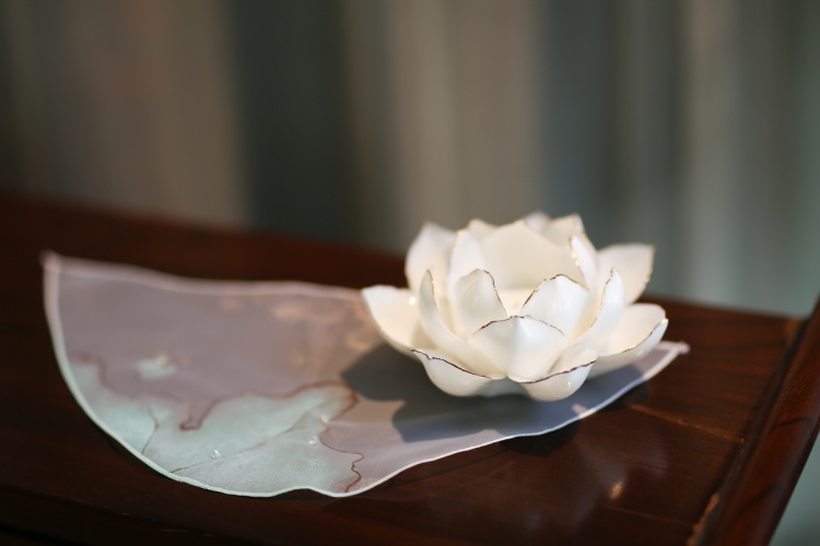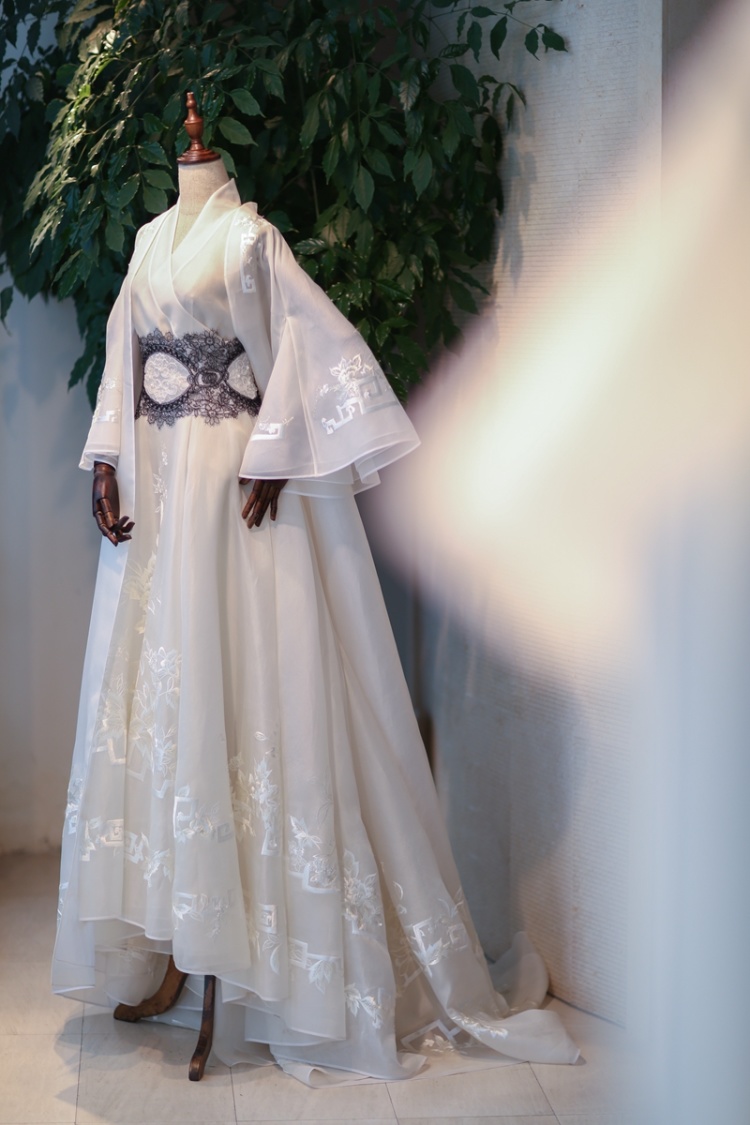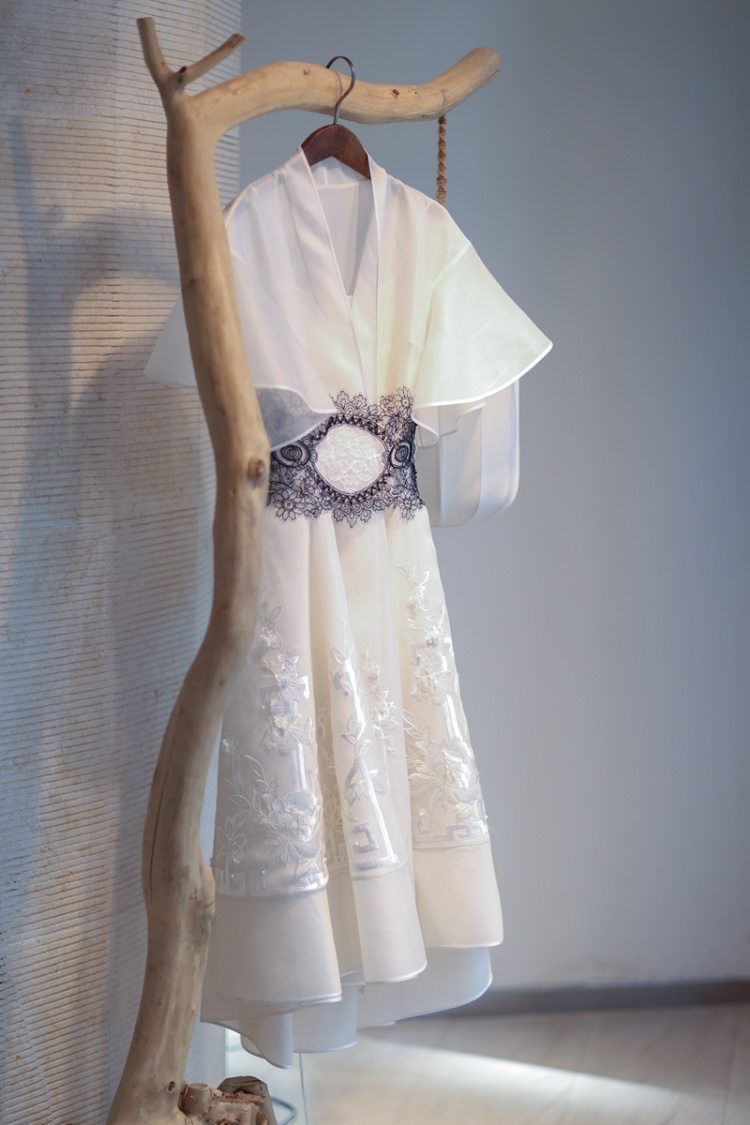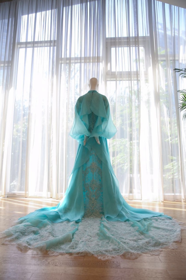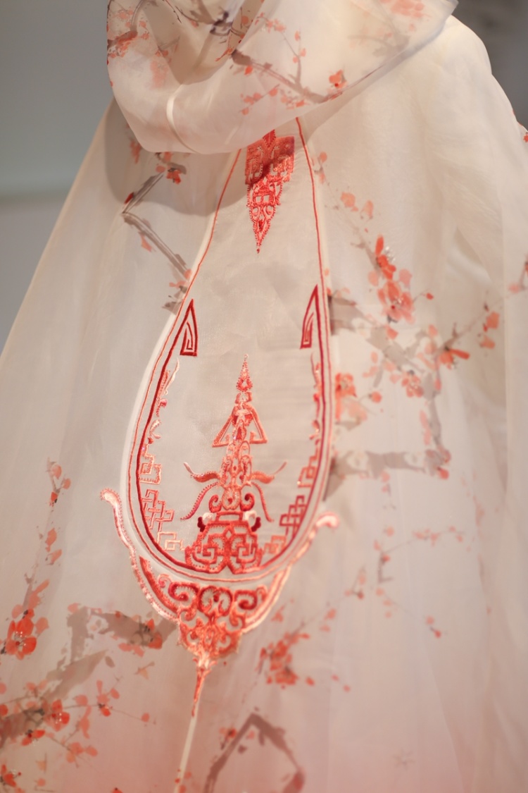 A:在西施系列中,我们为了达到层次分明,所有图案交至在一起后形成一幅立体画卷的效果。分别运用传统工笔绘画融合壁画着色技巧,在薄纱上进行图案块面式的表达,仅这一项工艺我们就在近30种面料上多次尝试,直到呈现出最佳效果,突出图案浮于纱面。结合局部虚实苏绣工艺,再装点玉露水滴。达到清荷在薄雾间含露亭亭玉立,云鹤悠然在荷间仙舞的幻妙画卷…