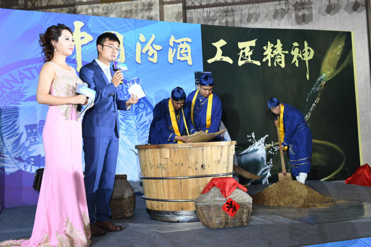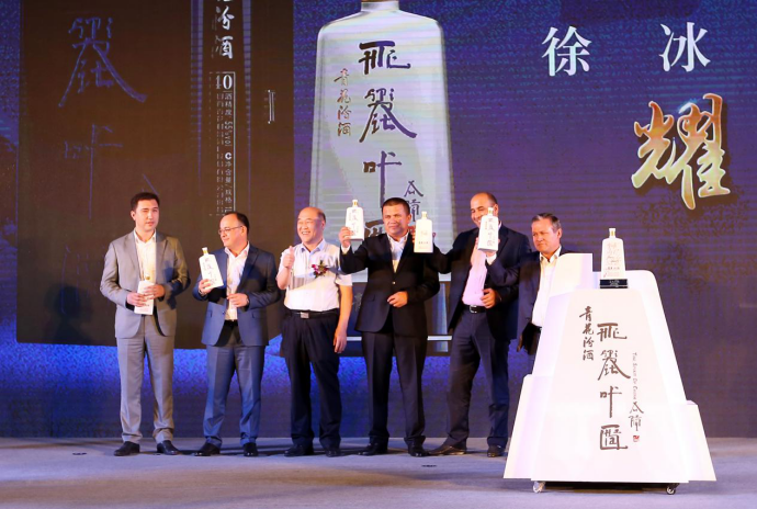 汾酒集团党委副书记、总经理、汾酒股份公司董事长谭忠豹与各国外宾共同发布“青花汾酒 徐冰艺术臻藏酒”。