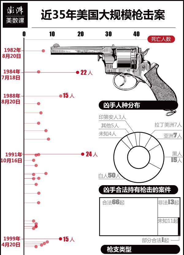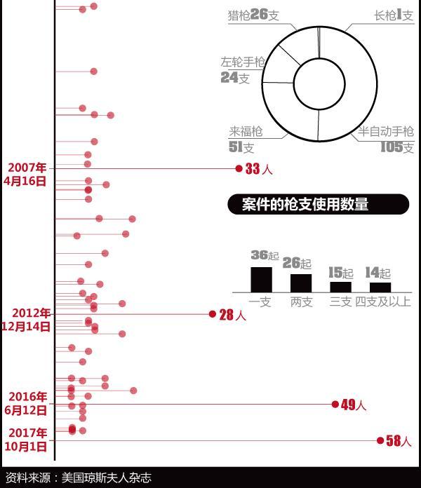 根据美国琼斯夫人杂志(Mother Jones)的数据显示,1982年至今美国共发生了91起大规模枪击案,共造成759死亡,1196人受伤(包括拉斯维加斯枪击案目前的伤亡情况)。