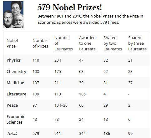 据诺贝尔奖官网统计,1901年至2016年间,诺贝尔奖各类奖项共计颁发了579次,其中物理学奖颁发次数最多,为110次。该奖项共颁发给了204人次。约翰•巴丁曾经两次获得这一殊荣,因此事实上共有203人获得过这一奖项。
