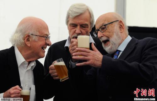 当地时间10月24日,西班牙奥维耶多,2013年诺贝尔物理学奖得主——比利时理论物理学家弗朗索瓦⋅恩格勒亮相新闻发布会。发布会后弗朗索瓦⋅恩格勒高举酒杯。