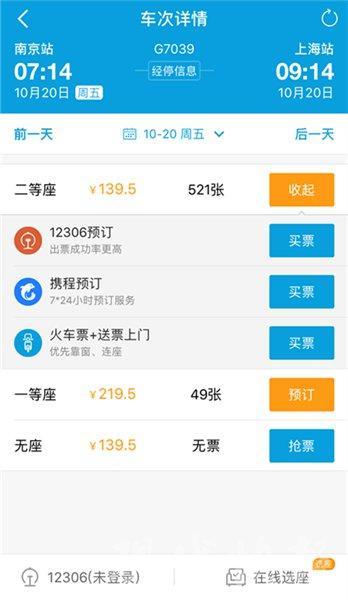打开 " 携程 "APP,选择购买 10 月 20 日从南京去往上海的 G7039 次列车。软件显示有票,并提供了 "12306 预订 "" 携程预订 "" 火车票 + 送票上门 " 三种买票方式。记者点击 " 携程预订 ",页面跳转到了订单填写,票价显示 159.5 元,开始,记者没反应过来,差点就要点击购买了。突然意识到,好像价格不对!