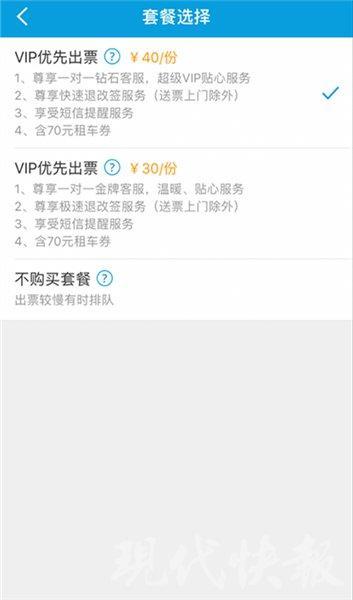 不仅如此,现代快报记者体验发现,"VIP 优先出票 " 套餐也是丰富多样,从 10 元 / 份到 40 元 / 份的都有。比如,记者选择购买 10 月 12 日从南京去往深圳的 D3125 次列车,"VIP 优先出票 " 套餐价格变成了 40 元或 30 元每份。但仔细对比,套餐包含的内容,只有 " 专人客服服务 "" 一对一钻石客服,超级 VIP 贴心服务 "" 一对一金牌客服,温暖、贴心服务 " 的区别,其余的改签服务、短信提醒服务、70 元租车券是一样的内容。