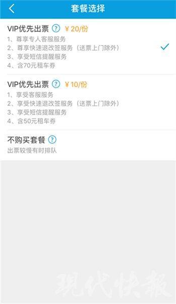 这份套餐价值 20 元一份,包括 " 享受专人客服服务,尊享快速退改签服务、享受短信提醒服务、含 70 元租车券 "。除了 20 元的套餐,还可以选择 "VIP 优先出票 "10 元套餐,除 " 享受客服服务、含 50 元租车券 ",此外都与 20 元套餐相同。