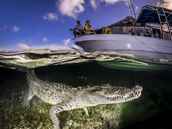 他在在波涛汹涌的索科罗岛拍摄自由潜水员与蝠鲼共舞。在人迹罕至的科科斯岛进行潜艇深潜探索。匍匐在古巴南部的红树林浅滩寻觅古巴鳄鱼的踪影。