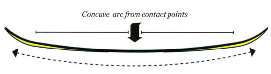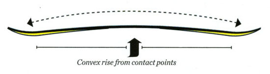 就像Camber的中文意思一样,它是一种中间向上拱起的板型,类似于拱桥的形状。不论是从形状上还是功能上,它与Rocker都形成了鲜明的对比。中间向上拱起的形状令其拥有了最大化的弹性积蓄量,让它在ollie、nollie等动作上表现相当优异,如果你可以熟练的ollie,那么你能明显的感受到Camber给你带来的巨大弹性,常被用在大跳台上和U池中的Burton的Custom X就是一个非常典型的例子。雪板两头时刻接触雪面,而我们双脚站在两个接触点中间,这意味着最大化的有效边刃长度,同时避免了板头板尾在切雪过程中的抖动,从实际效果上来看就是刻滑时能够给我们带来极高的稳定性。