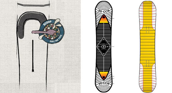 勺子其实是国内雪友中对一类具有类似特点雪板的统一叫法,Bataleon TBT、Burton scoop以及Rome 3DCCR技术的雪板都是我们统称的勺子板,这其中Bataleon的TBT板型是勺子中最为出名的。勺子是一种比较特殊的板型,它不止是板体横向上的变化,而是一种立体的版型变化,因为板头板尾比较像勺子的形状而得名(如上图)。