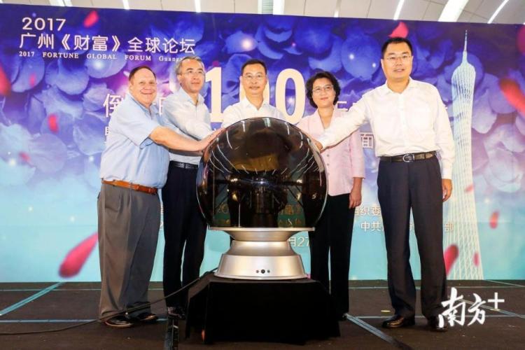 广州市市长、 2017广州《财富》全球论坛组织委员会主任温国辉(中),市委常委、宣传部长、2017广州《财富》全球论坛组织委员会副主任徐咏虹(右二),市委常委、市政府党组成员、2017广州《财富》全球论坛组织委员会副主任、执行委员会主任蔡朝林(左二),南方报业传媒集团党委书记、南方日报社社长刘红兵(右一),央视特约评论员、美国前总统卡特法律顾问、ABC电视台前台长、副总裁哈维•佐丁(Harvey Cary Dzodin)(左一)共同启动了寻访“全球财富故事•百张广东面孔”活动。