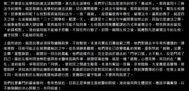 更棘手的是,由于现在学校都是面向社会招生和招聘教师的,所以如今香港社会中的那些极端思想,甚至也开始侵入“港专”这种传统“爱国爱港”学校。去年和今年“港专”的毕业典礼上连续出现对国歌不尊敬的行为,就令人感到一丝忧虑。