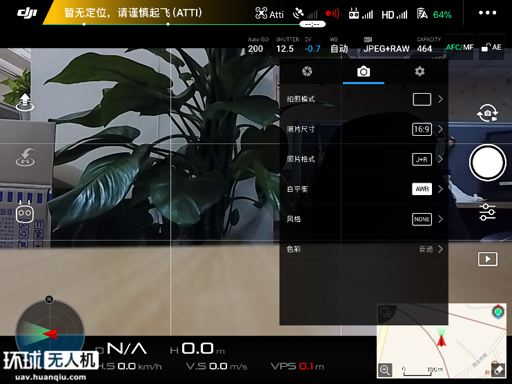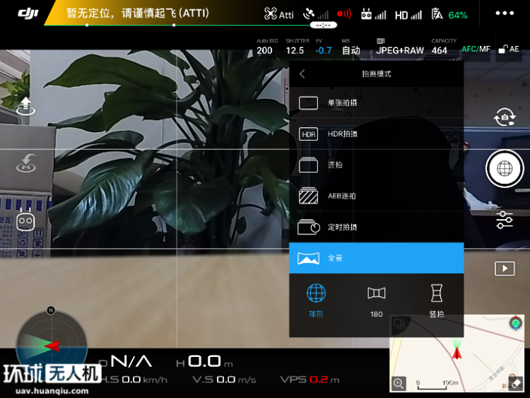 1 连接好设备,飞行器飞至空中,调整好拍摄角度和相关参数,一键全景前最好试拍图片,查看是否存在照片过曝等问题,以便及时调整。