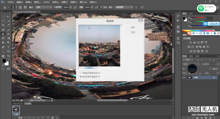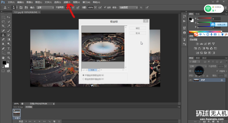 2 点击滤镜—扭曲—极坐标。点击平面坐标到极坐标,就可以看到天空的竖缝了,然后调整图片至合适的大小,点击确定。