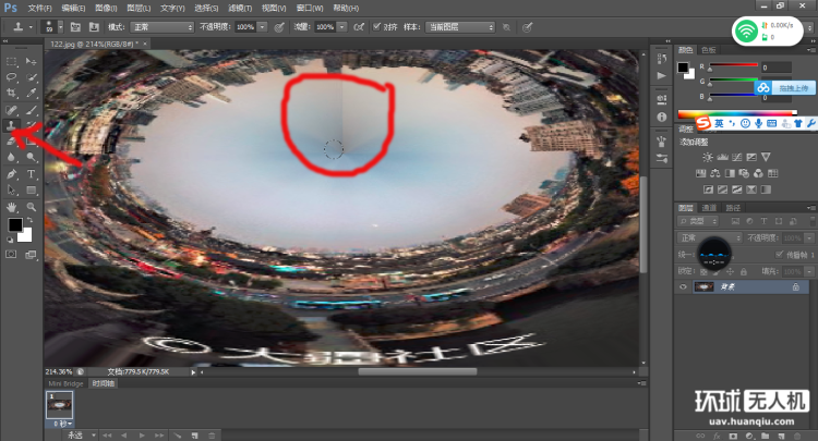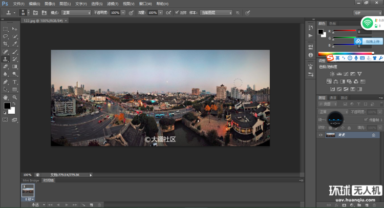 第二个瑕疵则可通过把自动合成后的全景图导出来,放入PS中,简单处理一下,就可做出一张天衣无缝的全景图了。接下来,让我们来简单学习一下吧(因北京禁飞,就到大疆论坛里下载了一张图)。
