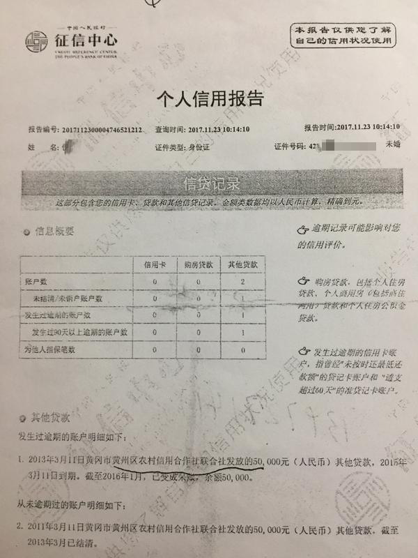 11月23日,倪明到中国银行查询个人征信记录,还真查出了问题。系统显示其在2013年11月在黄冈市黄州区农村信用合作社联合社贷了5万元的款,截至2015年到期日尚未还款。
