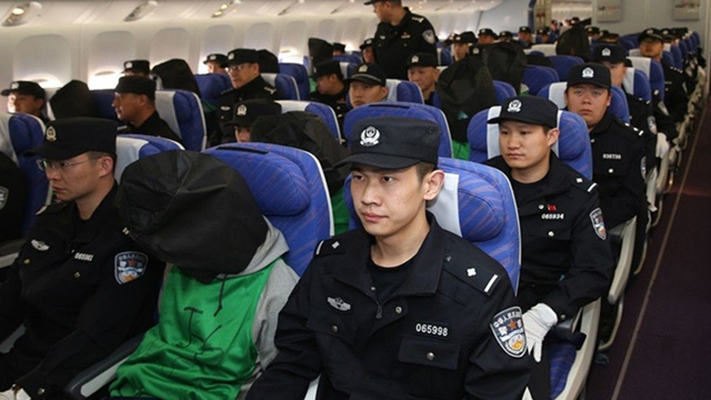 2016年4月13日,团伙成员统一带头套,坐飞机押送回国。