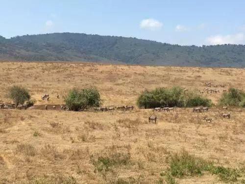 四点钟后,我们坐上自己来时坐的车,发现已经变了样。原来这种车子是可以把顶撑起来,变成敞蓬车,游客可以站起来,头伸出车顶观看动物和风景。车子刚开出不久,就往后倒。我们都以为司机是走错路了。看到前面的车子也在往后倒。司机的对话机在响。原来是说是在前面的树下发现了两只狮子。于是大家一下子都兴奋起来。三个人都站了起来。远远的在平顶的金合欢树下,一左一右地躺着两只狮子,虽然远,但看到它身上的皮毛在闪光。旁边的朋友的相机很好,能把狮子通过镜头吊很很近,于是我们看到右边的狮子正四脚朝天的躺着,还看到了它的皋丸。左边的狮子则安静地趴在树下,身材要小一点。两只狮子的形态都很优闲,看上去都肥肥的。估计也不饿。离它们不远,一群群的斑马和羚羊在安静地吃草。狮子也没有去攻击它们。车子慢慢地走,我们慢慢地欣赏狮子。