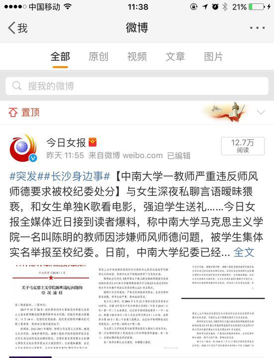 举报信中还提到,临近期末时,陈明多次向学生索要礼物,2015级的学生无奈一起送了一个礼物给他。陈明甚至用成绩威胁学生,“你们如果把我骚扰女生的事说出去,就给你们全年级不及格”。