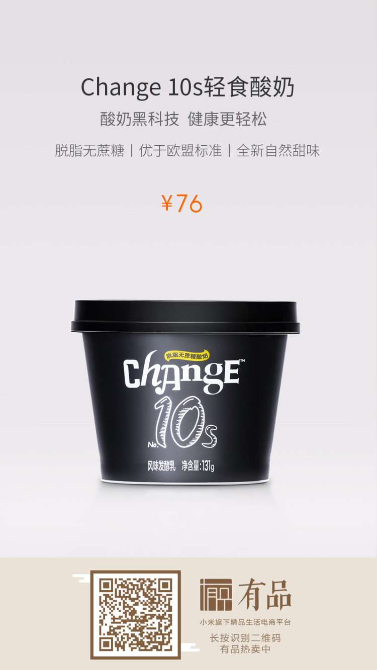 Change 10s脱脂无蔗糖轻食酸奶,在有品APP上架