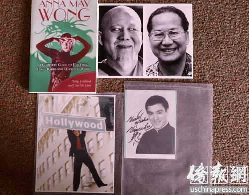 陈灿培收集的华裔影星照片。左上角为黄柳霜,右上角为陆锡麒与他的银幕形象,左下角为成龙,右下角为李小龙。(美国《侨报》记者/邱晨 翻拍)