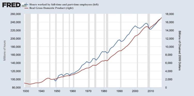 人们还可以从另一个角度来思考生产力和劳动之间的关系:真正的技术失业将揭示生产总量(国内生产总值)和劳动者年工作时间总量的差距不断扩大。相反,经济数据显示两条线几乎是完美的串联,这表明我们的经济增长与自动化无关,而是与劳动者有关。