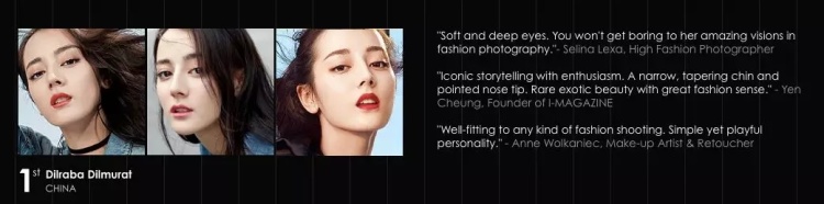 整个评选花了三个月,40个国家的380位专业摄影师、设计师、造型师、化妆师、时尚编辑以及I-Magazine团队成员从35000张照片和视频里选出,听着也是有点厉害啊!