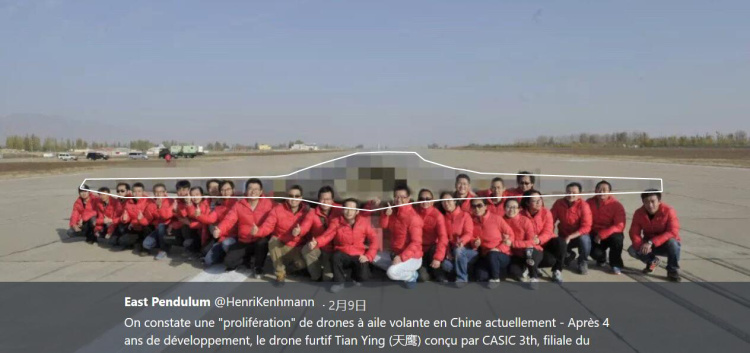 中国的飞翼式布局隐身无人机多个项目并存的现象,也为海外媒体注意到。近日,自媒体上传播着一款名为“新天鹰”无人机的飞行测试成功后的合影照片,照片虽有打码但外形可鉴,应是采用飞翼式隐身布局。有媒体称之为“惊艳世界的新型隐身长航时无人机”。