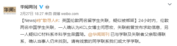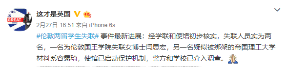 前一天,中国驻英国伦敦大使馆发布消息称,2月26日,伦敦国王学院闫姓中国女留学生家属向使馆求助,称女留学生近日失联,希望使馆协助寻人。在使馆建议下,家属已向伦敦警方报案。使馆已向警方表达关切并希望警方加紧办案,同时协调有关学联协助寻找闫某。