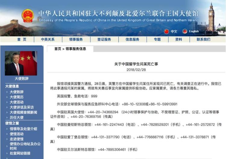中国驻英国伦敦大使馆也发布消息:28日晨,英警方在中国留学生闫某住所发现闫已死亡,有关调查正在进行中。我馆已将此事通报闫某的家属,将就有关善后事宜向家属提供积极协助。应家属要求,请各方尊重其隐私。