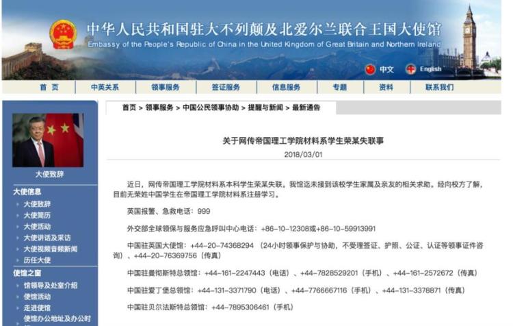 近日,网传帝国理工学院材料系本科学生荣某失联。我馆迄未接到该校学生家属及亲友的相关求助。经向校方了解,目前无荣姓中国学生在帝国理工学院材料系注册学习。