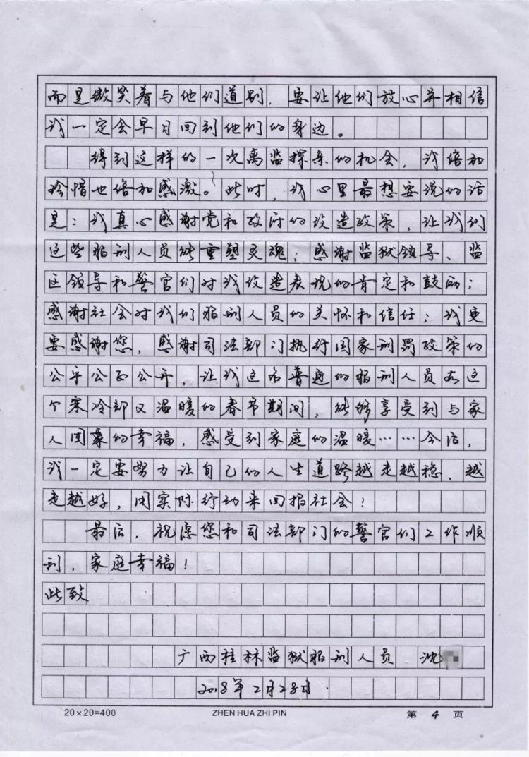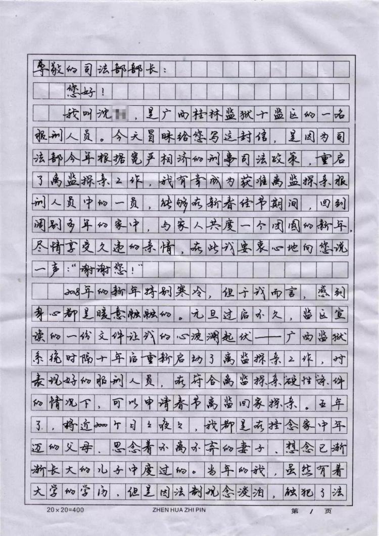 我叫沈明(化名),是广西桂林监狱十监区的一名服刑人员。今天冒昧给您写这封信,是因为司法部今年根据宽严相济的刑事司法政策,重启了离监探亲工作,我有幸成为获准离监探亲服刑人员中的一员,能够在新春佳节期间,回到阔别多年的家中,与家人共度一个团圆的新年,尽情享受久违的亲情,在此我要衷心地向您说一声:“谢谢您!”