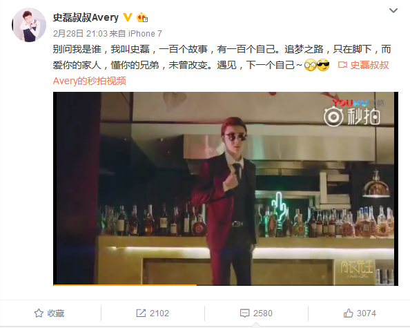 随着时尚轻喜剧《内衣先生》的热播,一人分饰三角的新生代青春演员史磊也是人气大增。昨晚史磊在个人微博发布了一条感言: “别问我是谁,我叫史磊,一百个故事,有一百个自己。追梦之路,只在脚下,而爱你的家人,懂你的兄弟,未曾改变。遇见,下一个自己~”短短数语既与《内衣先生》中的角色与主题呼应,又展现了追梦向前的励志正能量。微博一经发布,便引来了明星团的点赞转发与网友的疯狂打call。关晓彤前排“支持小宝哥哥”,此外乔欣、林妙可、熊梓淇、盛冠森等众星也纷纷评论点赞,人缘这么好的史磊究竟有什么来头呢?