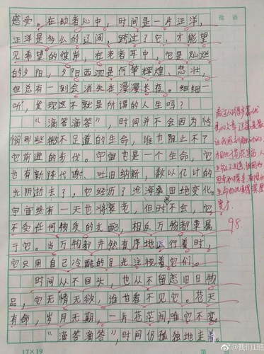 她晒出的一篇学生作文,因为其中一段关于时间的思考,迅速在网上走红,截止晚上8点,已收获1万评论、5万转发和10万点赞,并被许多微博大V争相转发——