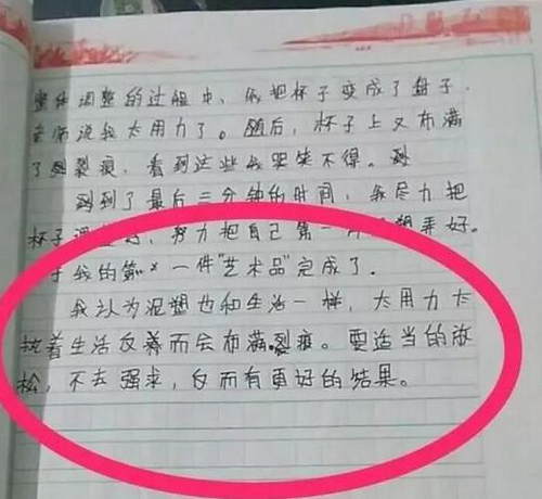 “泥塑也和生活一样,太用力太执着,反而会让生活布满裂痕……”这段文字,也是出自一名六年级小朋友之手。