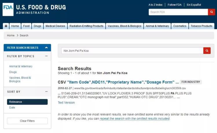 事实上,念慈菴川贝枇杷膏的安全性和有效性并没有经过 FDA 的检验,记者在 FDA 官网输入念慈菴川贝枇杷膏,并未查询到相关信息。