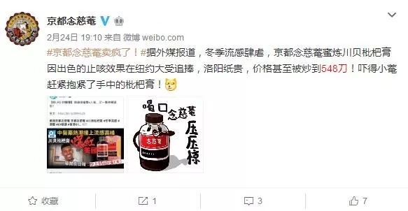 24日,京都念慈菴官微还截图香港某媒体发的新闻,称据外媒报道,京都念慈菴蜜炼川贝枇杷膏被炒到548刀(合约3455元人民币)!