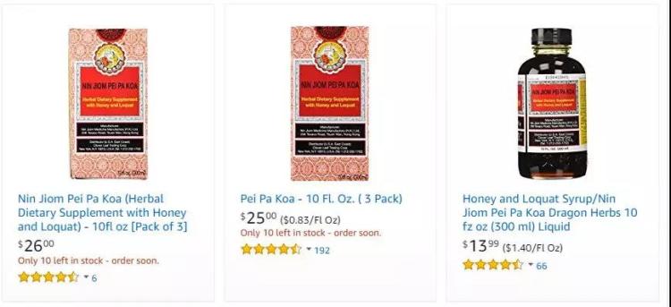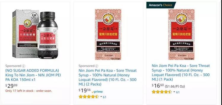 然而在亚马逊搜索发现,念慈菴川贝枇杷膏的价格并没有那么夸张,大都在13到30美刀之间,虽然有些显示货存不足,但总体显示有货。