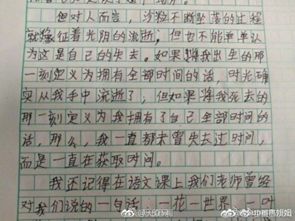 3月6日,宁波华天小学王老师的微博“我们1班王悦微”在微博上晒出六年级小学生小邵的作文《沙漏》,其中小邵对时间的理解让网友感到震惊。