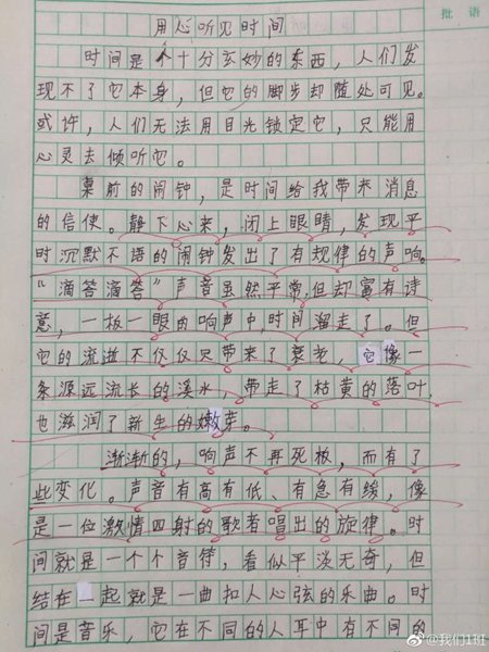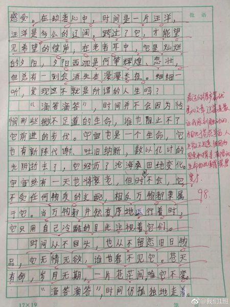 王老师说,她看过小邵的作文后写下了如下的评语:“帕斯卡说:‘人不过是一根苇草,是自然界里最脆弱的东西,但他是一根能思考的苇草。我们的全部尊严就在于能思考。’我很高兴,看到了一根苇草在我们班茁壮成长。很荣幸能成为你的老师,能得以分享你这些认真而精彩的思考。浸润于书中的人生必然会拥有一份与众不同的丰厚和深刻。祝你从中得到快乐,也期待你写出更多更好的文章。”