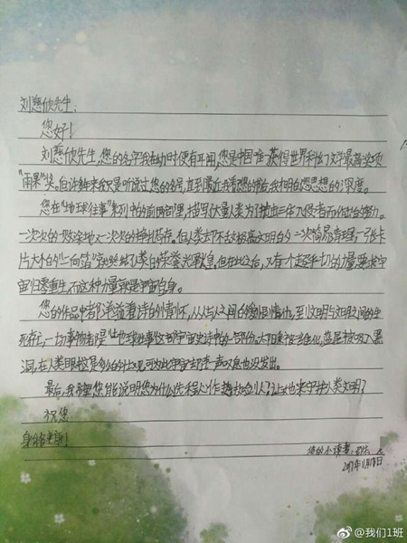 除此之外,小邵还曾经看过弗洛伊德的《梦的解析》、刘慈欣的《三体》,并在一次作文课中,小邵写给刘慈欣一封信,表达他对刘慈欣作品中的一些见解和疑问。