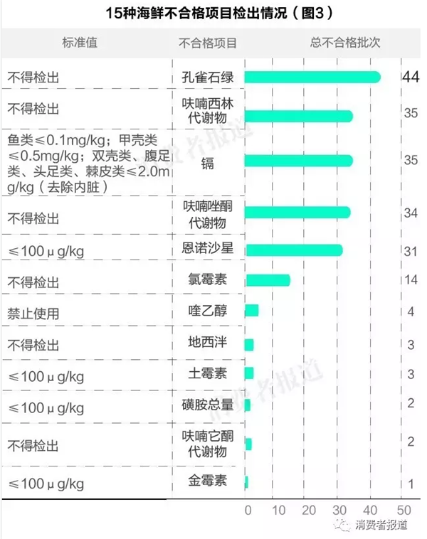 抽检结果显示,15种常见海鲜共抽检3876批次,其中检出不合格186批次,平均合格率达到86.7%。