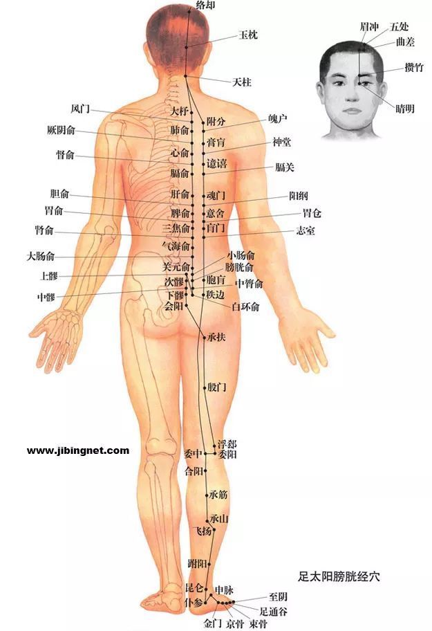 膀胱经是从头到脚贯穿全身的一条重要经脉,也是穴位最多的经络之一,于申时(即每天下午3点到5点)气血最旺。在这个时候按摩它,能更快把身体里的毒素排出体外,可以起到事半功倍的养生效果。