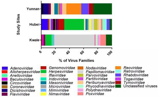 科研人员对采自中国和肯尼亚的蚊虫标本进行了高通量测序。他们对两地蚊虫携带的病毒谱进行比较分析,研究结果表明,蚊虫中病毒的分布存在地区特异性:比如肯尼亚标本里发现了登革病毒(属于黄病毒科Flaviviridae),而我国湖北和云南的标本里未见;同时,我国湖北和云南的样本中发现了大量的版纳病毒序列(属于呼肠孤病毒科Reoviridae),而肯尼亚样本中却没有该病毒的信息。