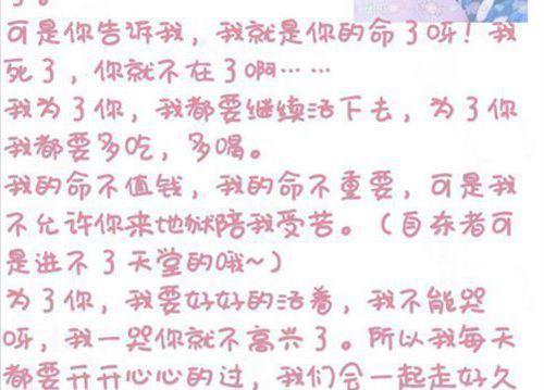 小霖花还特意选择了俏皮的圆体字,并用自己和妈妈的照片做成背景。懂事的小霖花写道:“你告诉我,我就是你的命,我死了,你就不在了。(所以)我为了你,都要活下去,为了你,我都要多吃、多喝。我不能哭,我一哭你就不高兴了,所以我每天都要开开心心地过……我不允许你来地狱陪我受苦,自杀者可是进不了天堂的哦!