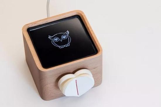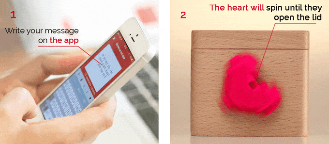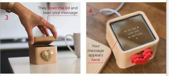 木盒子外有一颗突出的爱心,当用户通过App发送文字讯息时,它就会转动起来,表示对方心脏因思念你而跳动,直到有人打开盒盖才会停止,同时文字也会显示在内部的屏幕上。