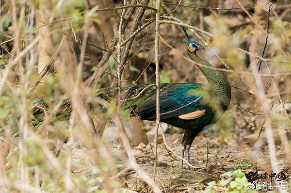 绿孔雀,国家一级保护动物。2017年3月,云南双柏县恐龙河自然保护区中,绿孔雀雄鸟亚成体可见未生长完全的羽屏。 奚志农 图绿孔雀