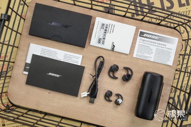 Bose SoundSport Free的全套:除了充电盒和耳机主体外,还有几份说明书、充电线、大小耳翼硅胶套。