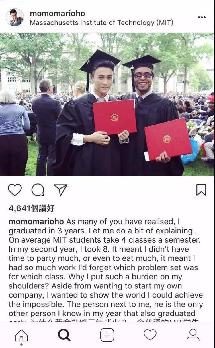 “为什么我会能够三年毕业?一个普通的MIT学生每个学期平均读4门课。大二那年,我每天没能吃没能睡,功课多到我经常忘了哪一份是哪一课的,就是因为每学期读了8门。”何猷君也曾在ins上坦言,即使是超强的学霸大脑,3年读完4门的功课,着实有点让人吃不消。