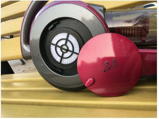 机身的一侧上面有一个小狗LOGO,而藏在标识之后的便是小狗D-615除螨仪的排风口,轻松一扭,可以通过开关锁将其打开。我们可以看到,白色部分为HEPA过滤,该模块可阻挡螨虫、灰尘等99.7%的颗粒物从机体内排出,同时能阻拦直径0.3微米的细微颗粒,从而排出洁净的空气,保证居室健康的同时不会造成二次污染。