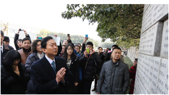 2013年1月17日,日本前首相鸠山由纪夫在侵华日军南京大屠杀遇难同胞纪念馆遇难者名单墙前祭奠遇难者。