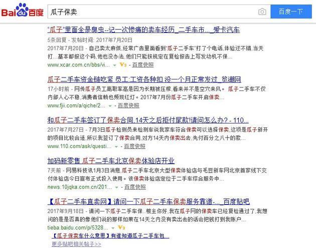 记者搜索关键词“瓜子保卖”,有保卖经历的个人车主的吐槽投诉占据了百度首页。
