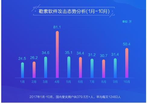 5月,WannaCry爆发,包括教育、企业、医疗、电力、能源、银行、交通等多行业受到影响。除“WannaCry”之外,各类新增勒索病毒及变种层出不穷。据统计,2017年电脑端新增勒索病毒变种达183种,全国至少有472万多台电脑遭到了这些病毒的攻击。